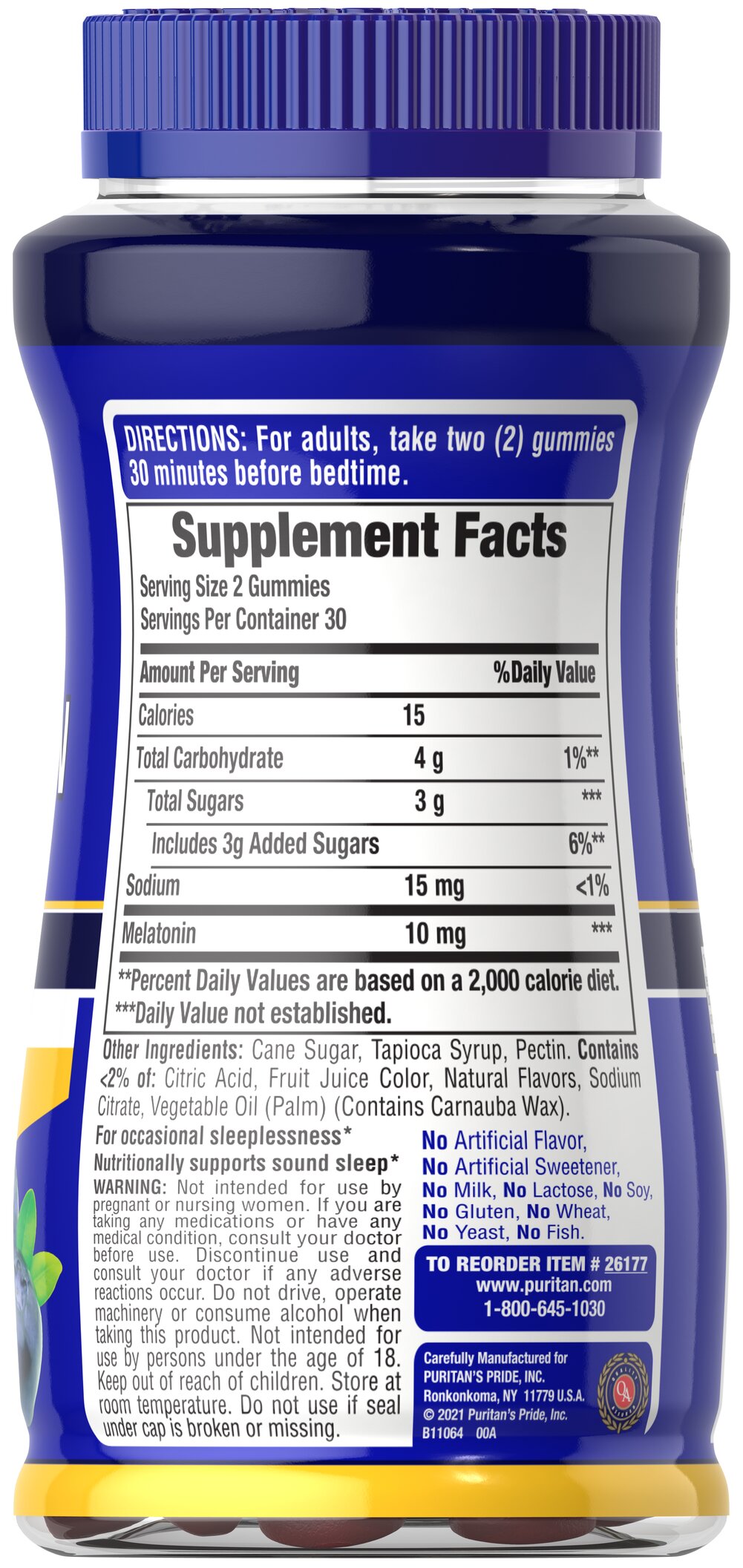 What’s more, these great-tasting blueberry-flavored gummies provide an easy, more convenient way to take your melatonin, especially if you don’t like swallowing pills. Adults can take two Melatonin 10mg Gummies 30 minutes before bedtime for a more restful night’s sleep.*
